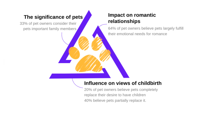 The intersection of pet ownership and lifestyle choices is striking: unmarried or childless individuals are significantly more likely to own pets. Notably, 73.5% of pet owners acknowledge that their pets influence their decision to have children, and 60% of pet owners admit their pets partially fulfill romantic needs, compared to less than 30% among non-pet owners.